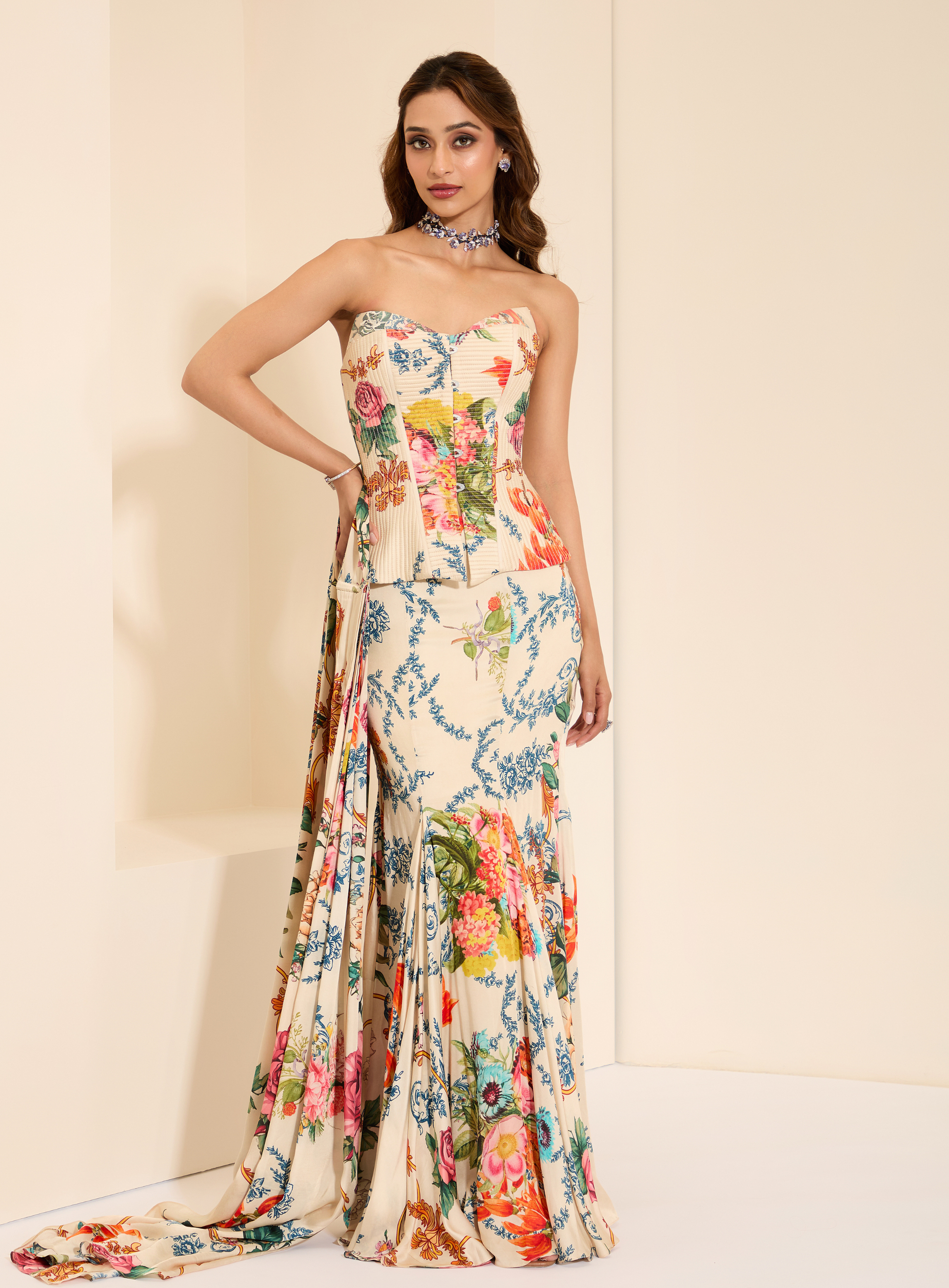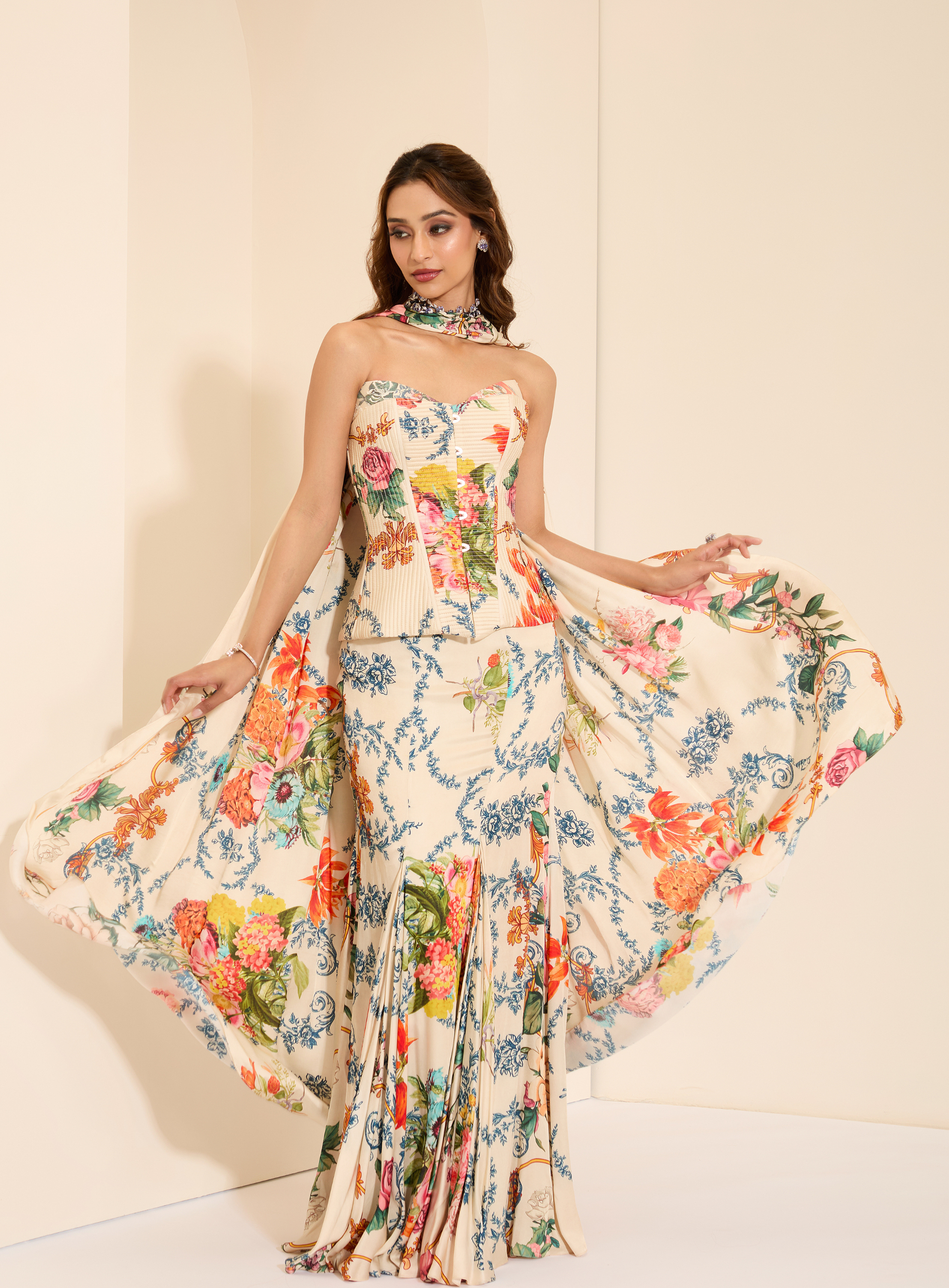 This Ivory baroque printed corset with drape skirt and stole exudes classic charm with modern twist. The intricate print adds a touch of opulence, while the corset and drape balances structure and softness which is ideal for elegance soirees or statement occasions.