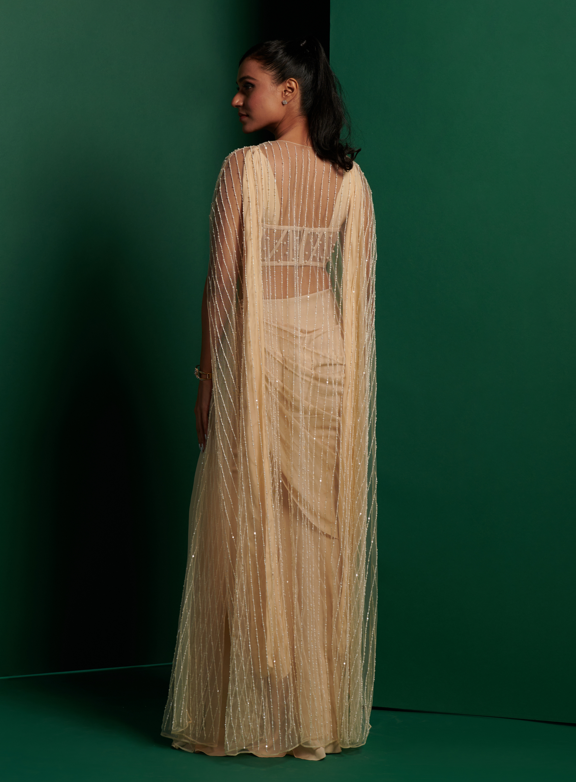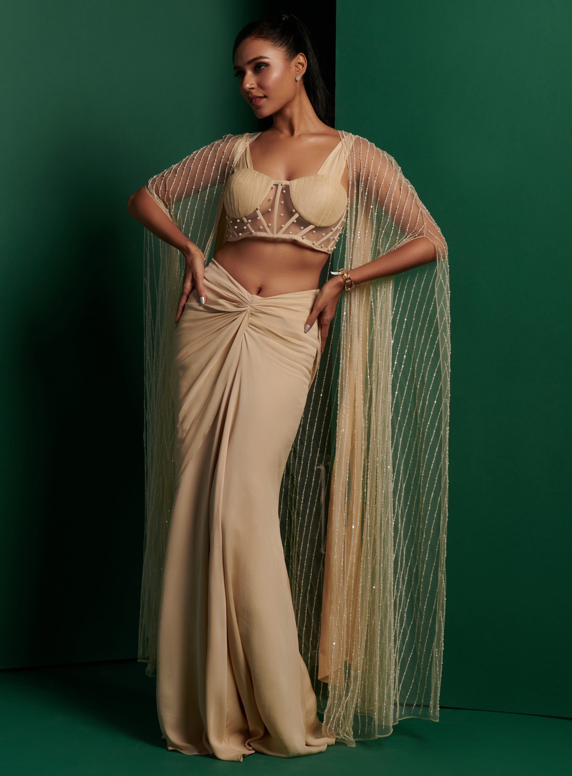 Feel beautiful in this luxurious buttercream pearl embellished corset with drape saree and cape. Every detail is designed to make you feel exquisite - from the beading to the sheer fabric. Step out in elegance and style for any special occasion.