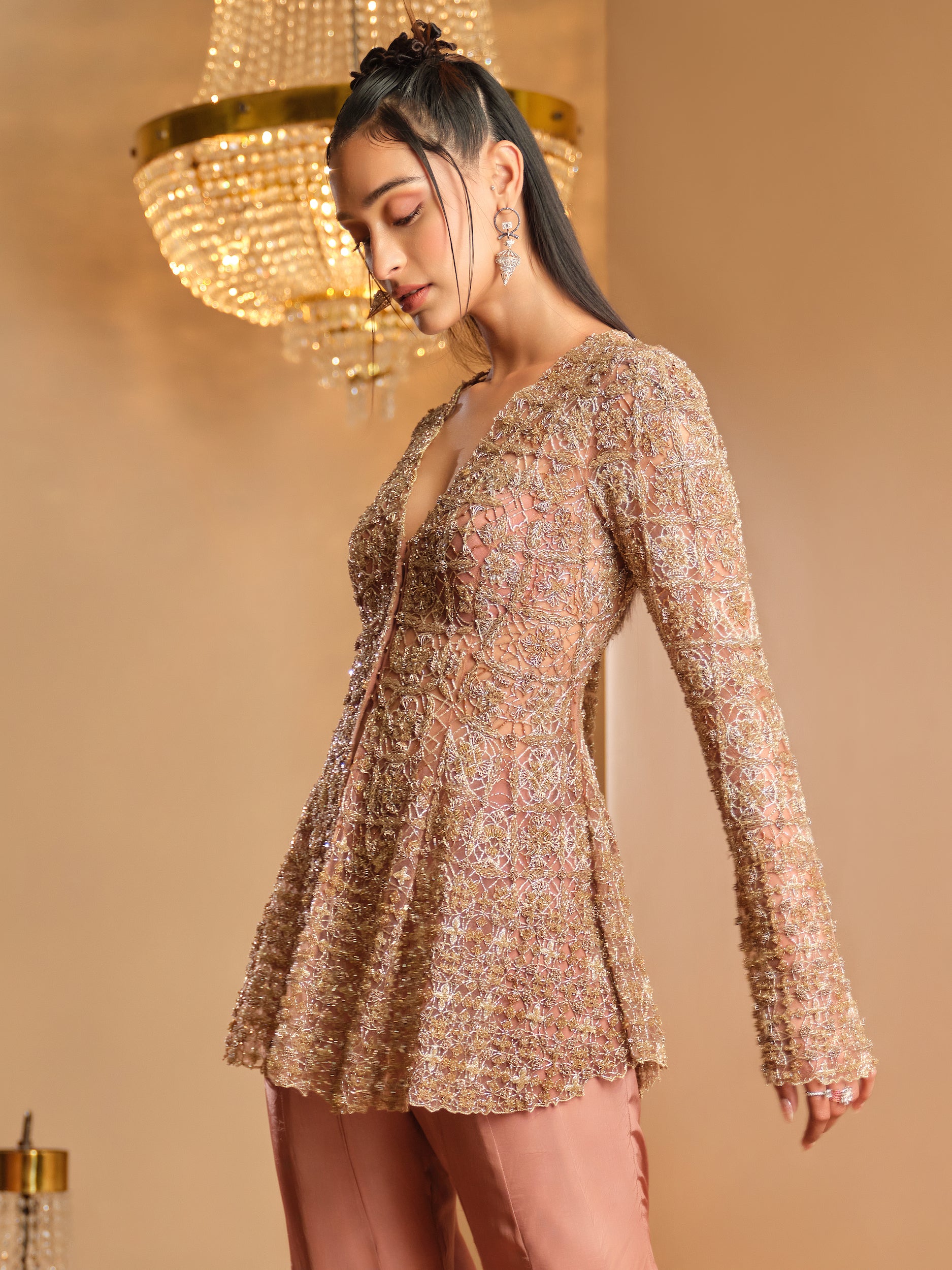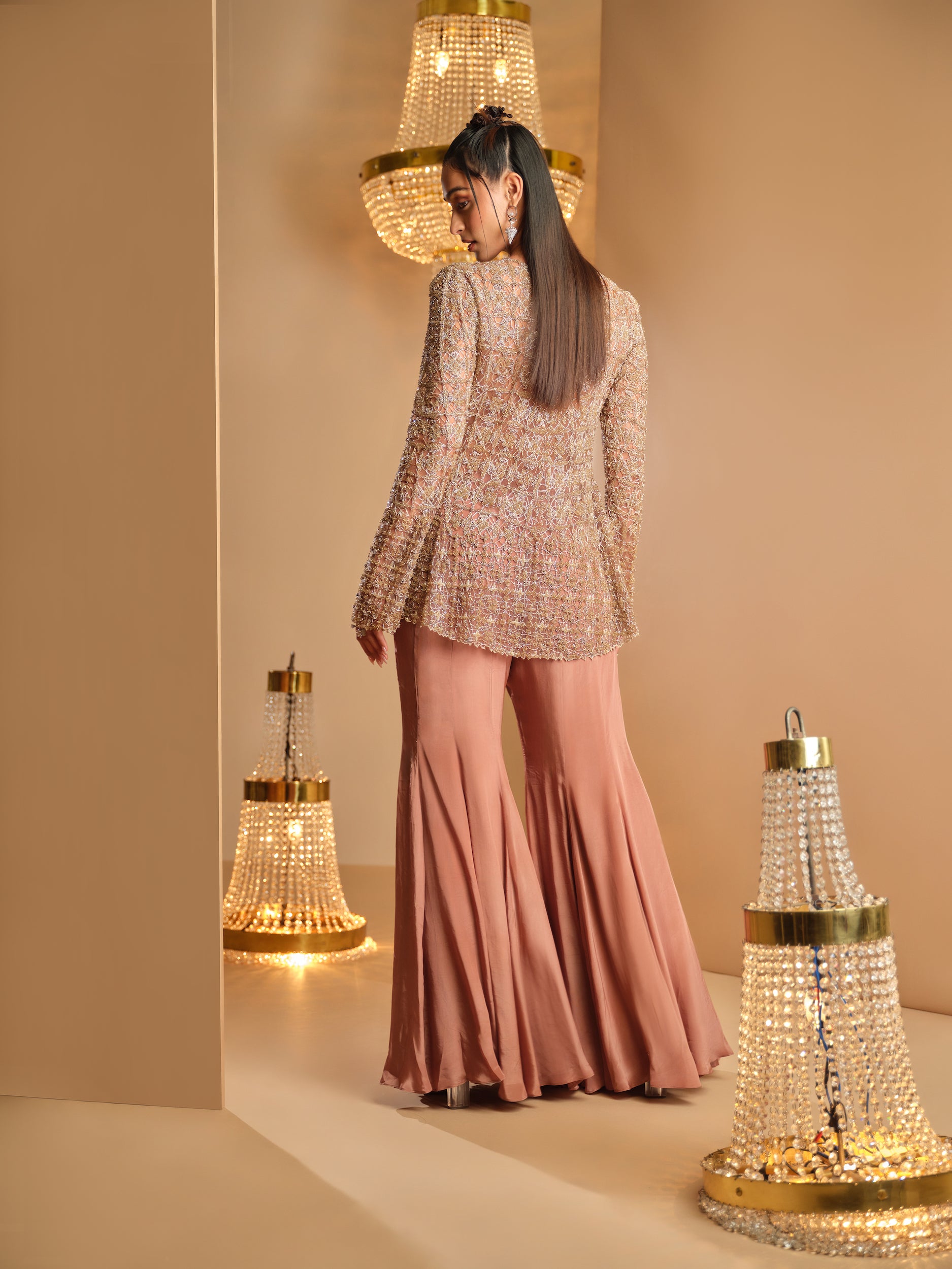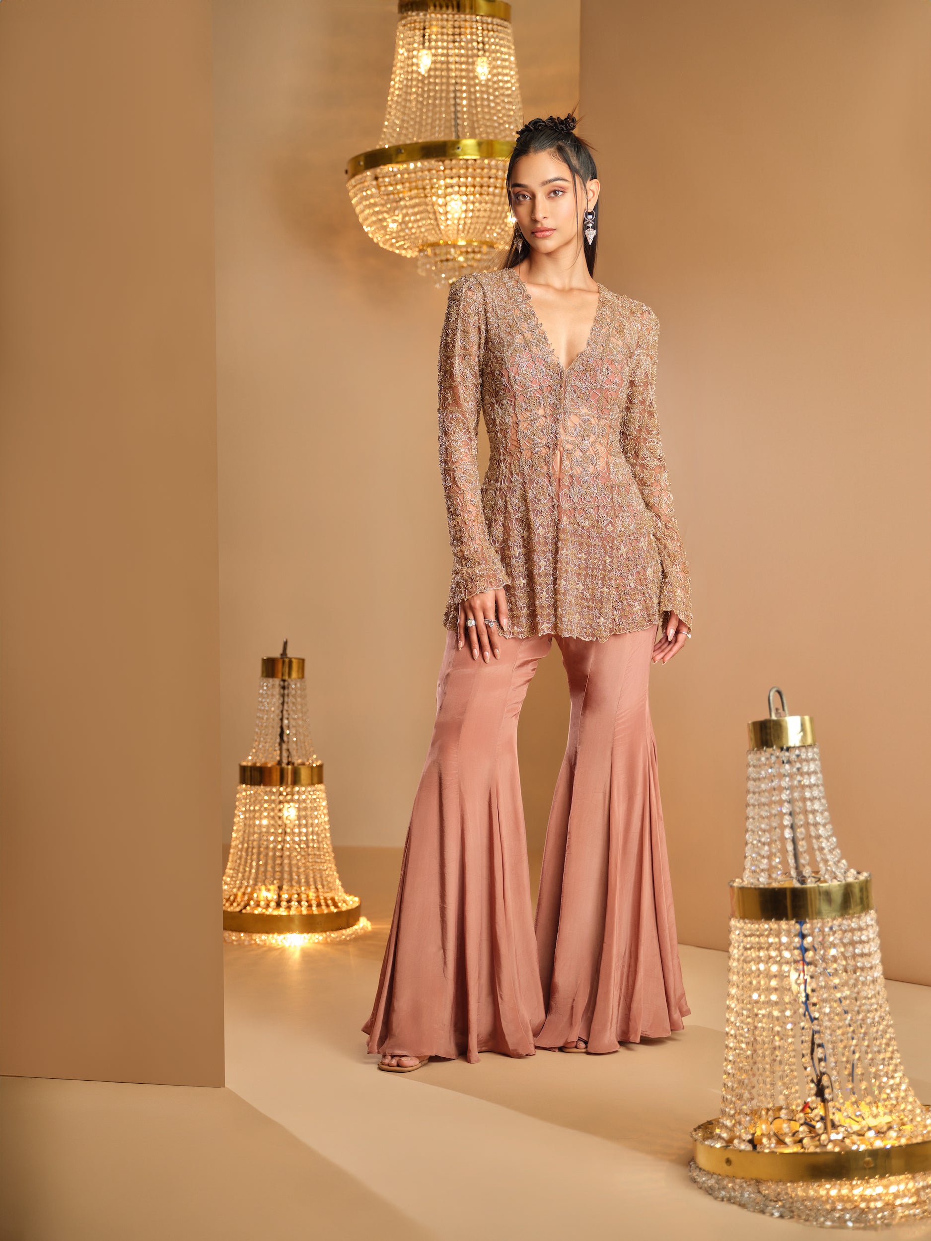 Indulge in luxury with our Chamkili Bhumi set. This stunning ensemble features an intricately embroidered jacket, paired with flattering flared pants and a bustier. Crafted with the finest materials, this set exudes elegance and sophistication. Elevate your wardrobe with this exclusive piece, perfect for any occasion.