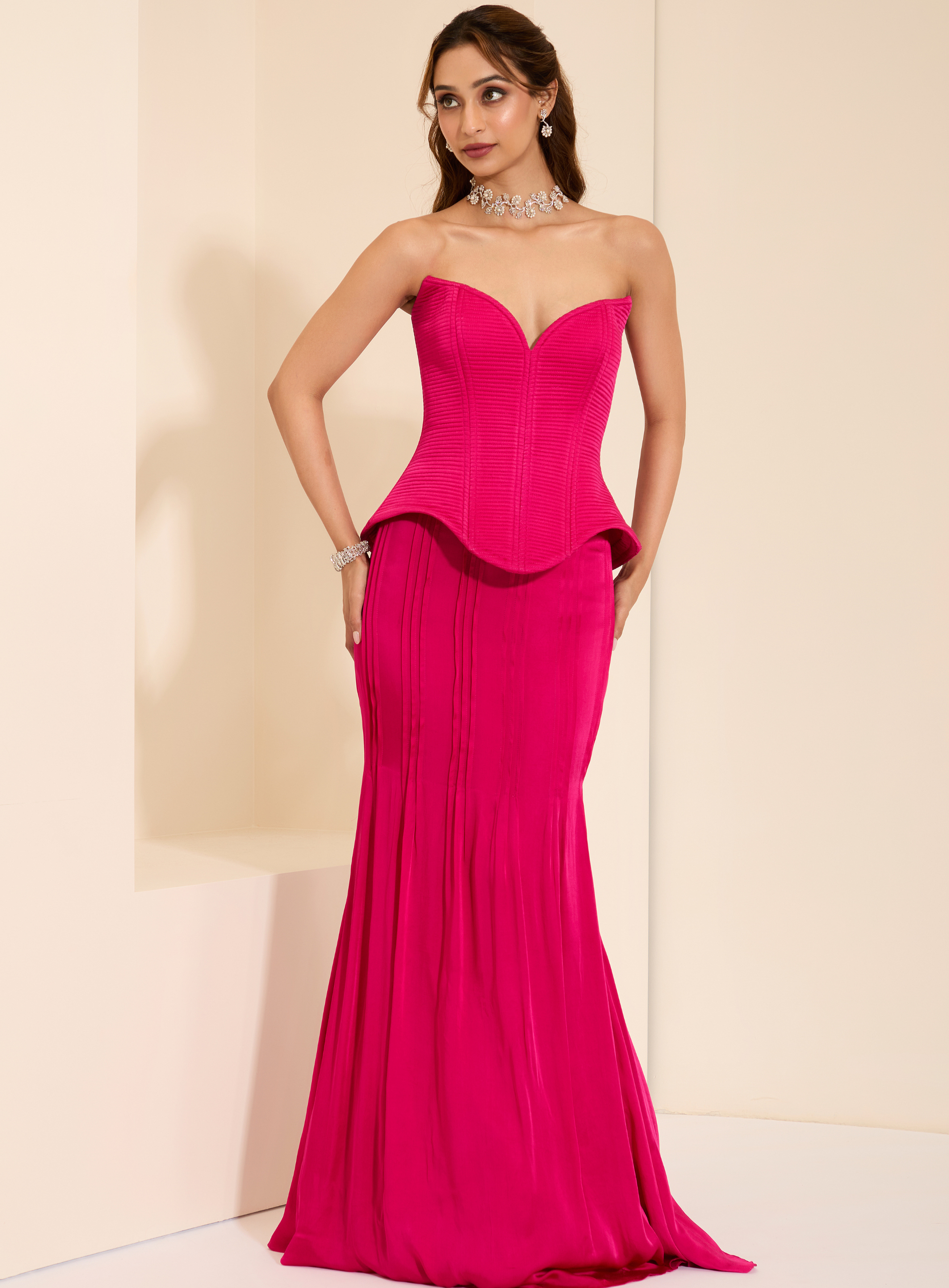 Fierce and feminine, this look commands attention with a hot pink quilted corset that brings sculptural edge and bold color. Paired with a flowing drape skirt, the silhouette feels both powerful and effortlessly fluid — a modern take on elevated glam.