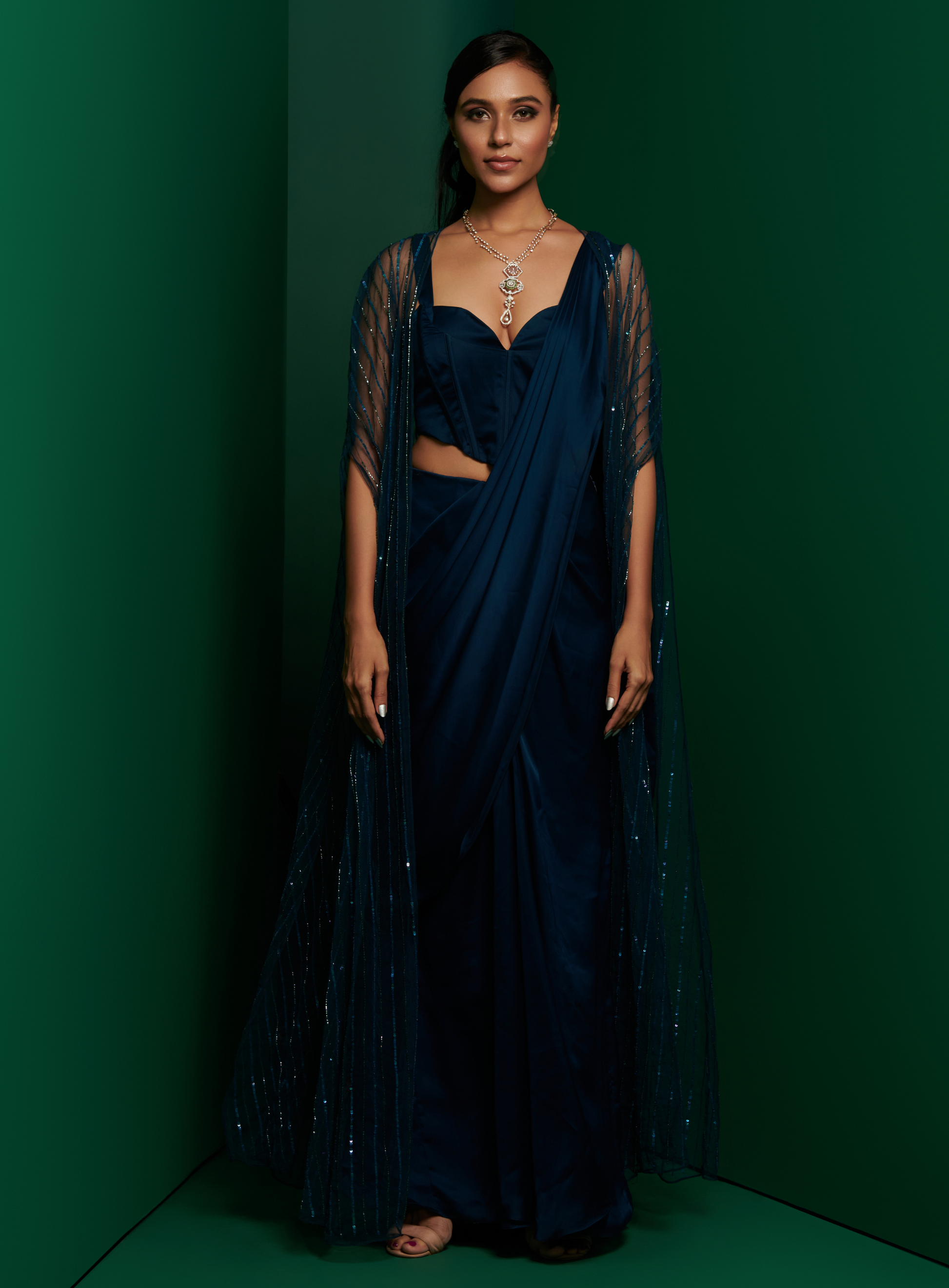 Navy Blue Sweet Heart Blouse With Gathered Slit Drape Skirt and Embellished Cape