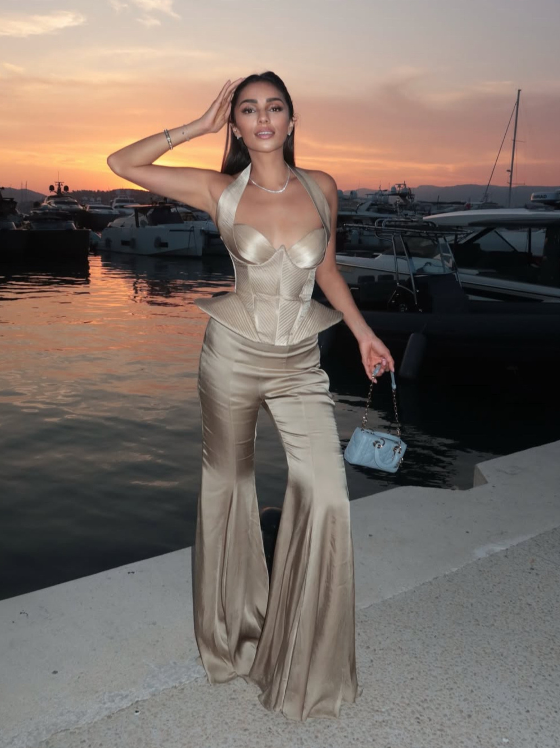 Crafted in rich olive gold hue, this structured quilted corset is designed to sculpt and flatter, pairing beautifully with fluid fit and flare pants. The result is a refined yet relaxed ensemble that moves with you while holding its shape, made for modern dressing with a touch of drama.
