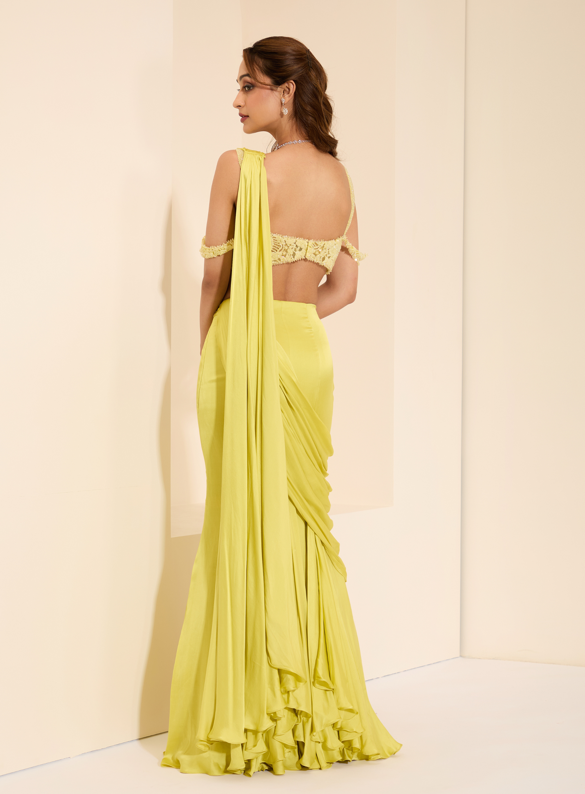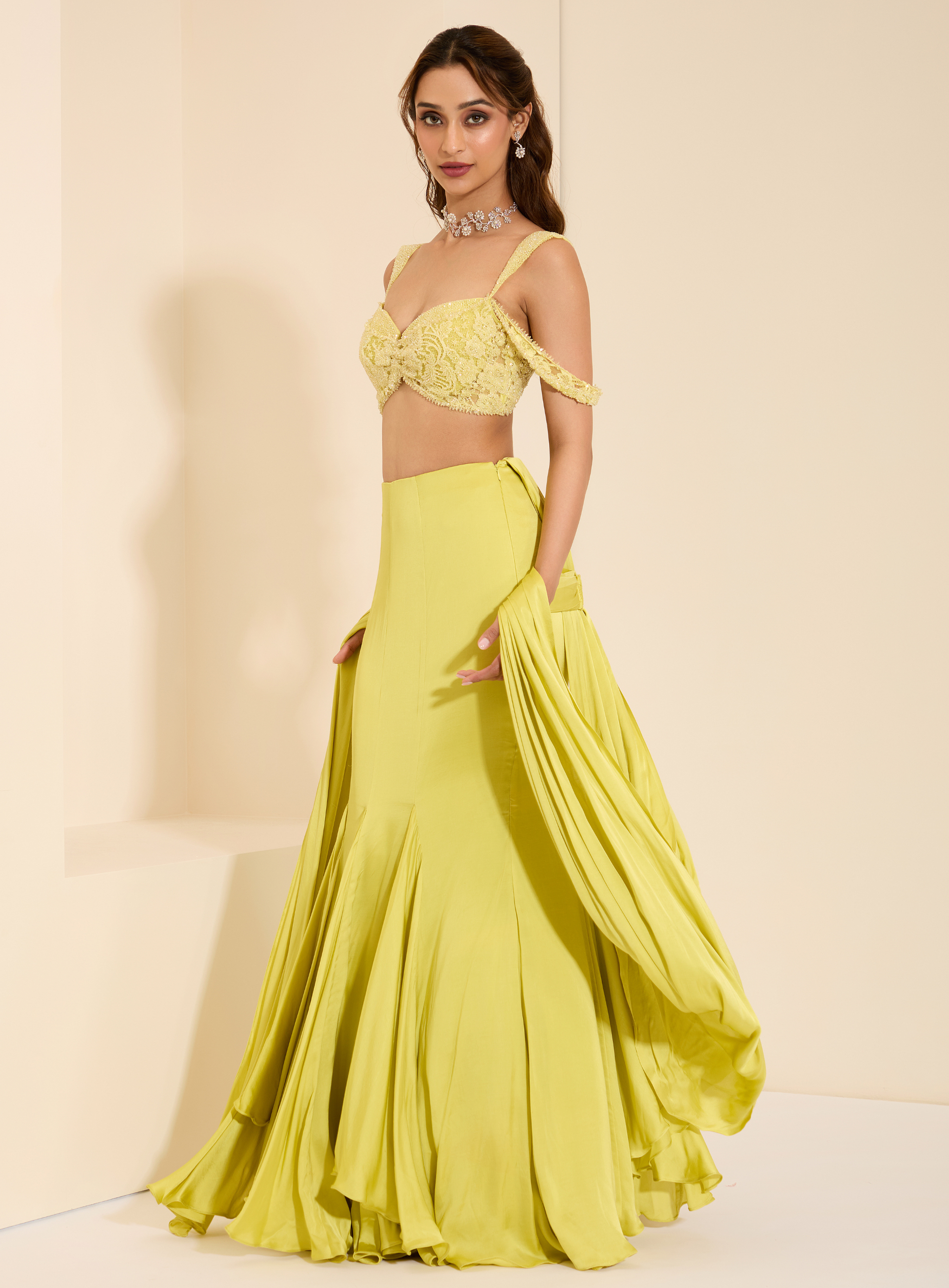A fresh take on elegance, this lime yellow ensemble radiates effortless charm. The Chantilly lace embroidered bustier, adorned with delicate detailing and soft off-shoulder straps, brings a touch of romance and modern femininity. Paired with a fluid drape saree, the look flows with grace — perfect for summer soirées, intimate celebrations, or a statement daytime event. Softly structured, delicately bold.